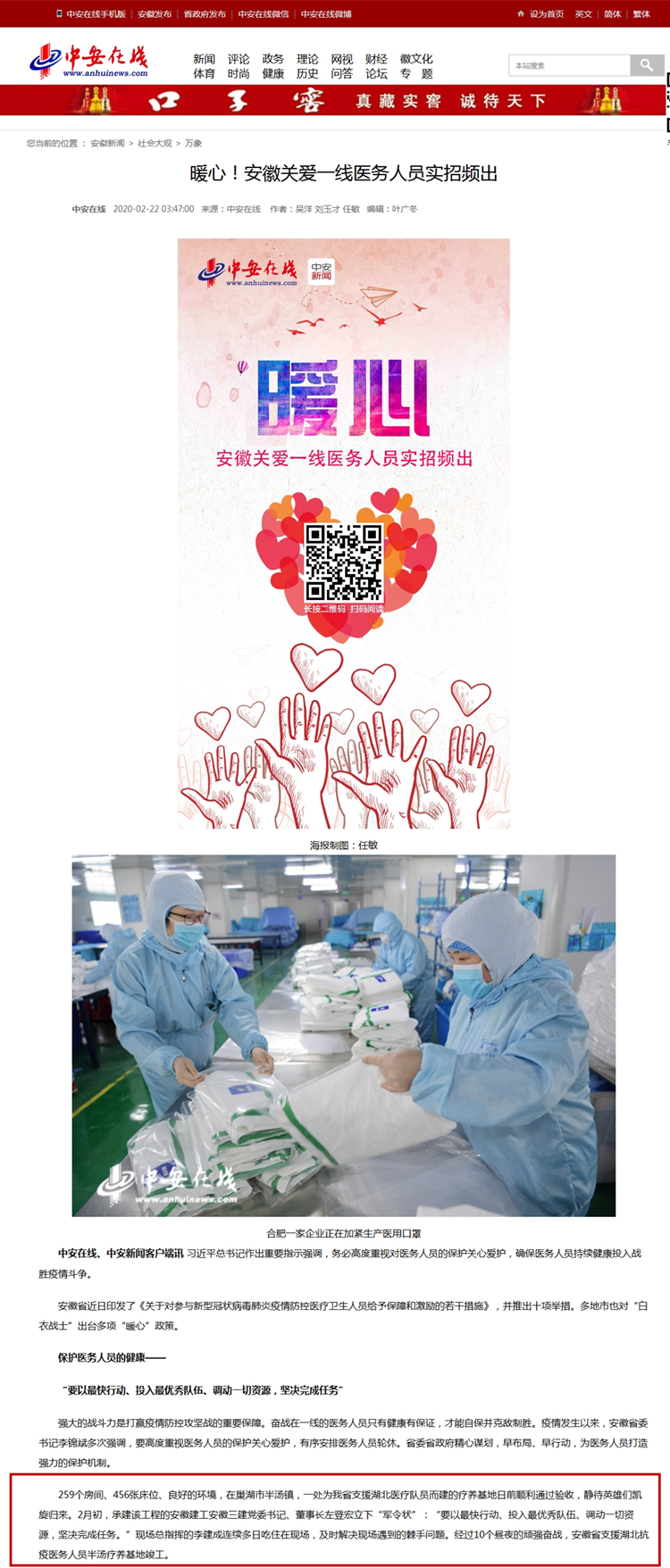 中安在線、央廣網(wǎng)、中新網(wǎng)、國際在線——暖心!安徽關(guān)愛一線醫(yī)務(wù)人員實(shí)招頻出 發(fā)布時(shí)間:2020-02-26 來源:中安在線、央廣網(wǎng)、中新網(wǎng)、國際在線 撰稿人: 瀏覽次數(shù):16313 網(wǎng)址鏈接: 中安在線:http://ah.anhuinews.com/system/2020/02/22/008352394.shtml 央廣網(wǎng):http://news.cnr.cn/native/gd/20200222/t20200222_524987284.shtml 中新網(wǎng):http://www.chinanews.com/sh/2020/02-22/9101239.shtml 國際在線: http://news.cri.cn/20200222/6faa4074-5d1b-ef06-5944-b8a7ca8d5931.html