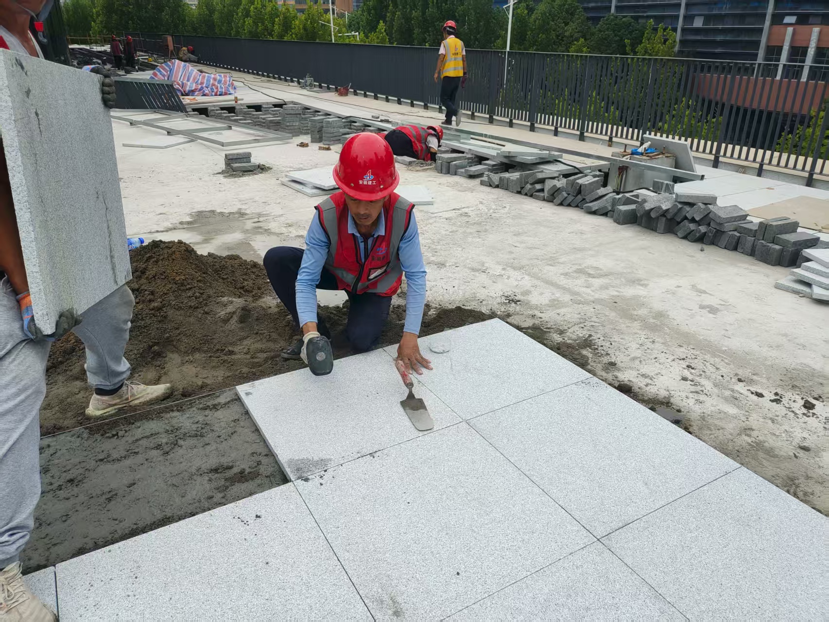 活動(dòng)當(dāng)日上午10時(shí),項(xiàng)目現(xiàn)場(chǎng)掀起“鋪磚技能競(jìng)賽”高潮,8名工人在40-50平方米的標(biāo)準(zhǔn)化賽區(qū)內(nèi)展開(kāi)激烈角逐,以“毫厘之間”的精準(zhǔn)度詮釋新時(shí)代工匠精神。競(jìng)賽現(xiàn)場(chǎng),參賽工人們精神抖擻,紛紛亮出“看家本領(lǐng)”:從精準(zhǔn)放線到規(guī)范取磚,從精細(xì)擺磚到嚴(yán)控磚縫,每個(gè)工序都展現(xiàn)出對(duì)“速度與質(zhì)量”的雙重追求。整場(chǎng)比賽在比學(xué)趕超中激發(fā)出大家“追求卓越、精益求精”的工匠熱情。