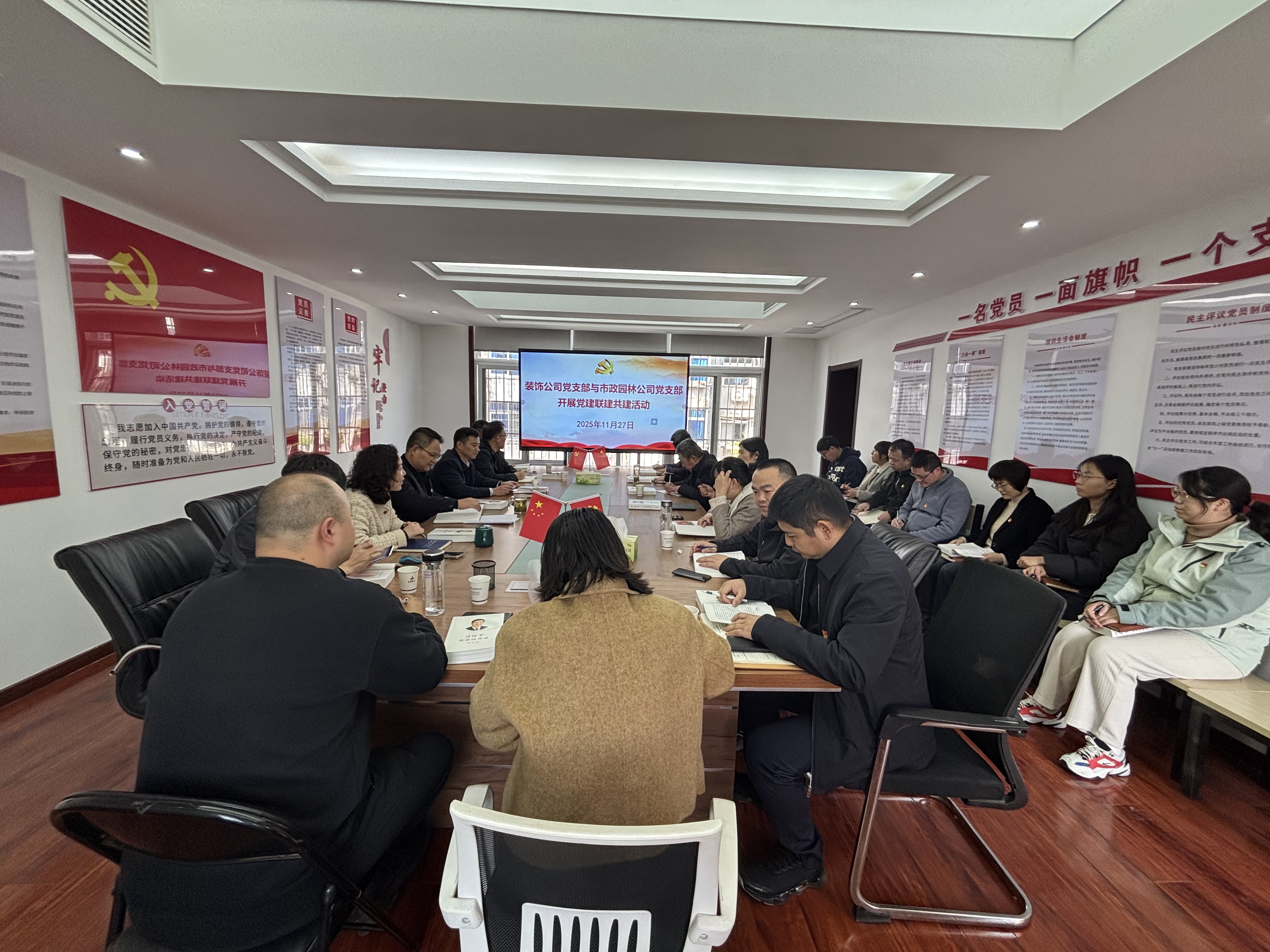為深入學(xué)習(xí)貫徹黨的二十屆四中全會(huì)精神,進(jìn)一步加強(qiáng)基層黨組織建設(shè),促進(jìn)兄弟單位間的交流與合作,11月27日下午,裝飾公司黨支部與市政園林公司黨支部聯(lián)合舉辦了以“聯(lián)學(xué)共建聚合力,理論武裝促提升”為主題的黨建聯(lián)建共建活動(dòng)。